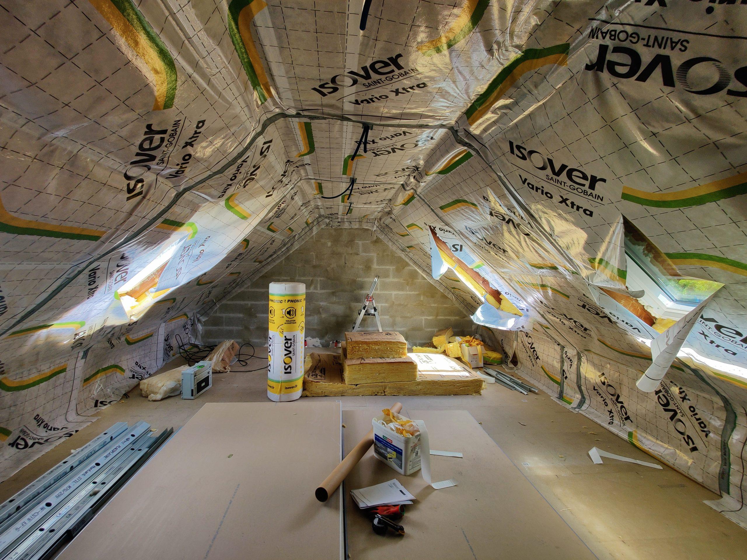 Isolation complète des combles et des rampants avec laine de verre et pose d’un pare-vapeur.