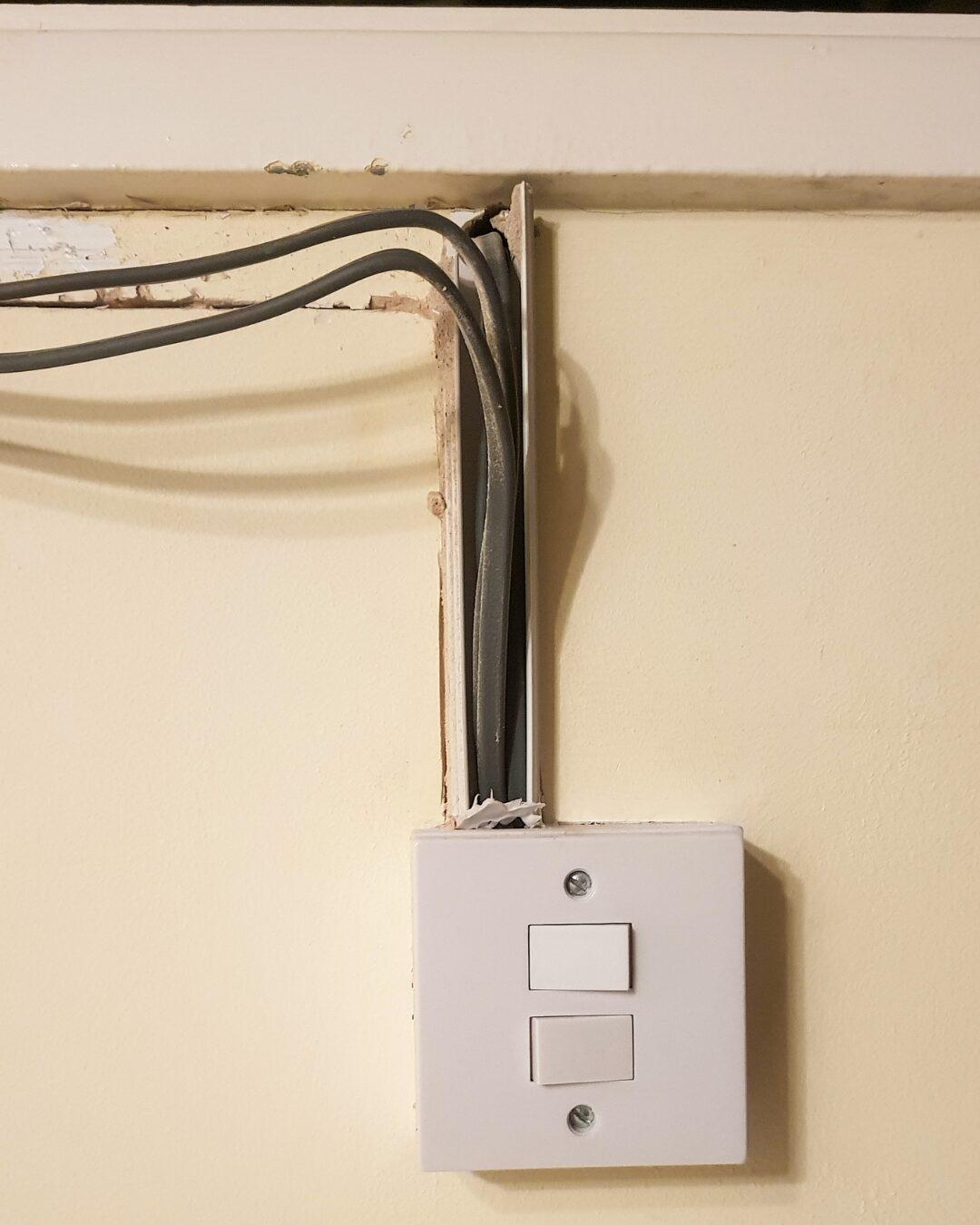 Cette image illustre une erreur courante commise lors de travaux de rénovation : une prise électrique avec des fils laissés apparents, révélant un manque de finition et de sécurité. Dans notre article “Les 5 erreurs les plus fréquentes en rénovation”, découvrez comment éviter ce type de négligence grâce à l’expertise d’Avinkel Rénovation, spécialiste à Paris.