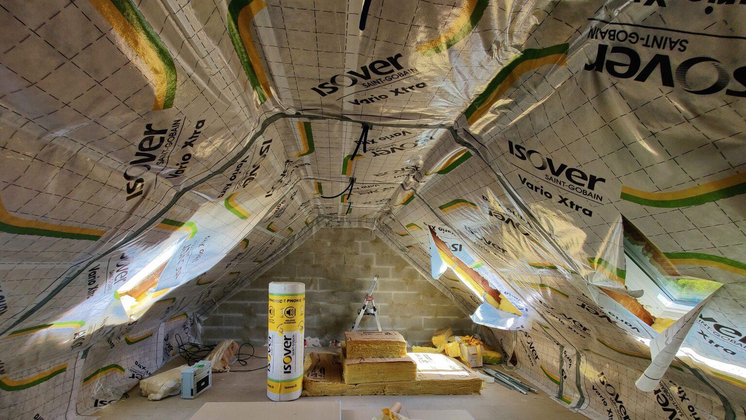 Photo illustrant l’isolation des combles et des rampants réalisée avec de la laine de verre, une solution efficace pour limiter les déperditions de chaleur et améliorer le confort thermique du logement. Ce visuel met en avant des travaux de rénovation énergétique essentiels pour optimiser les performances d’un habitat, notamment en période hivernale.