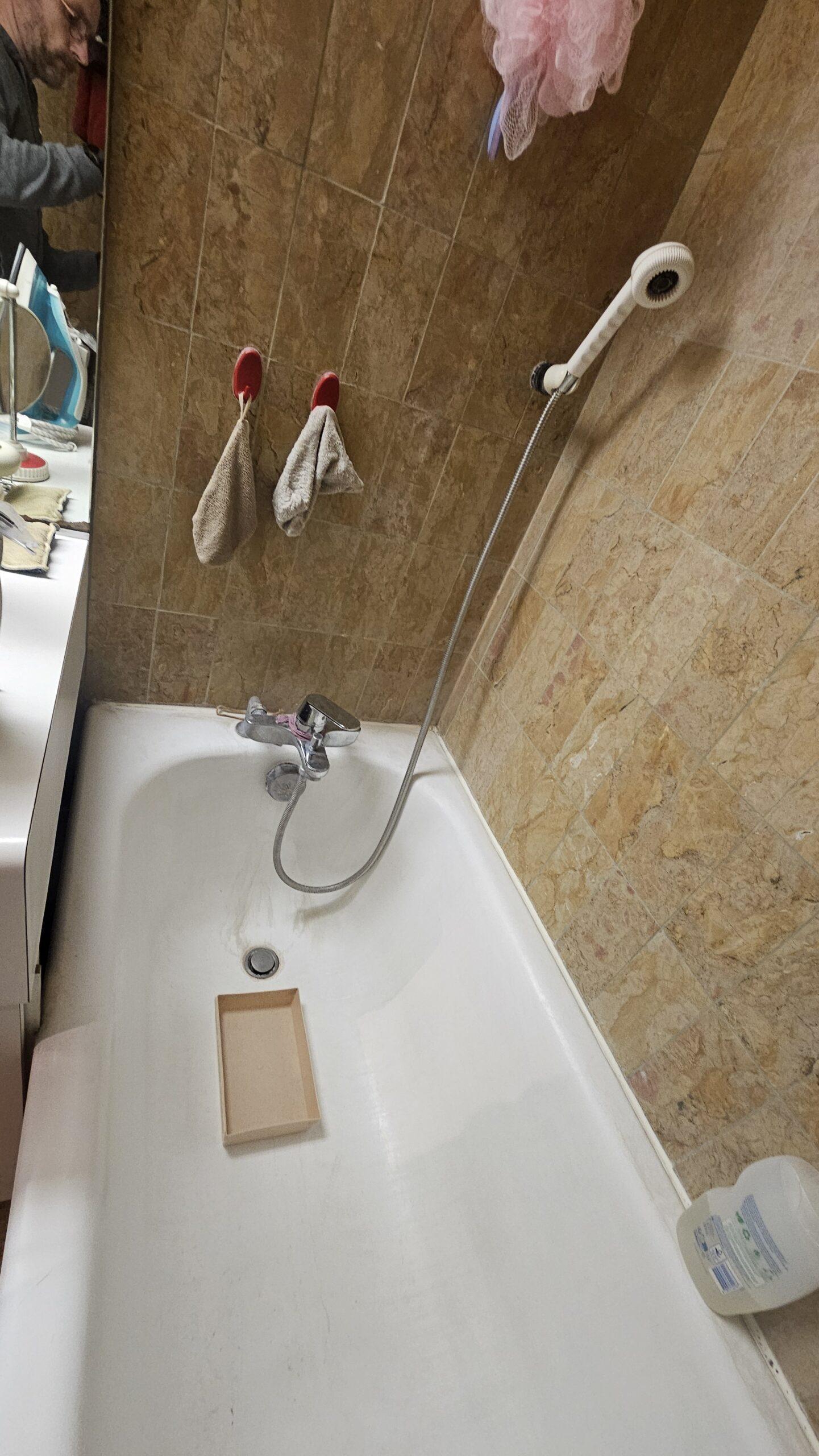Photo illustrant la transformation d’une baignoire existante en une douche moderne et fonctionnelle. Idéal pour montrer des travaux de rénovation visant à optimiser l’espace, moderniser la salle de bains et améliorer le confort au quotidien tout en conservant un design élégant.